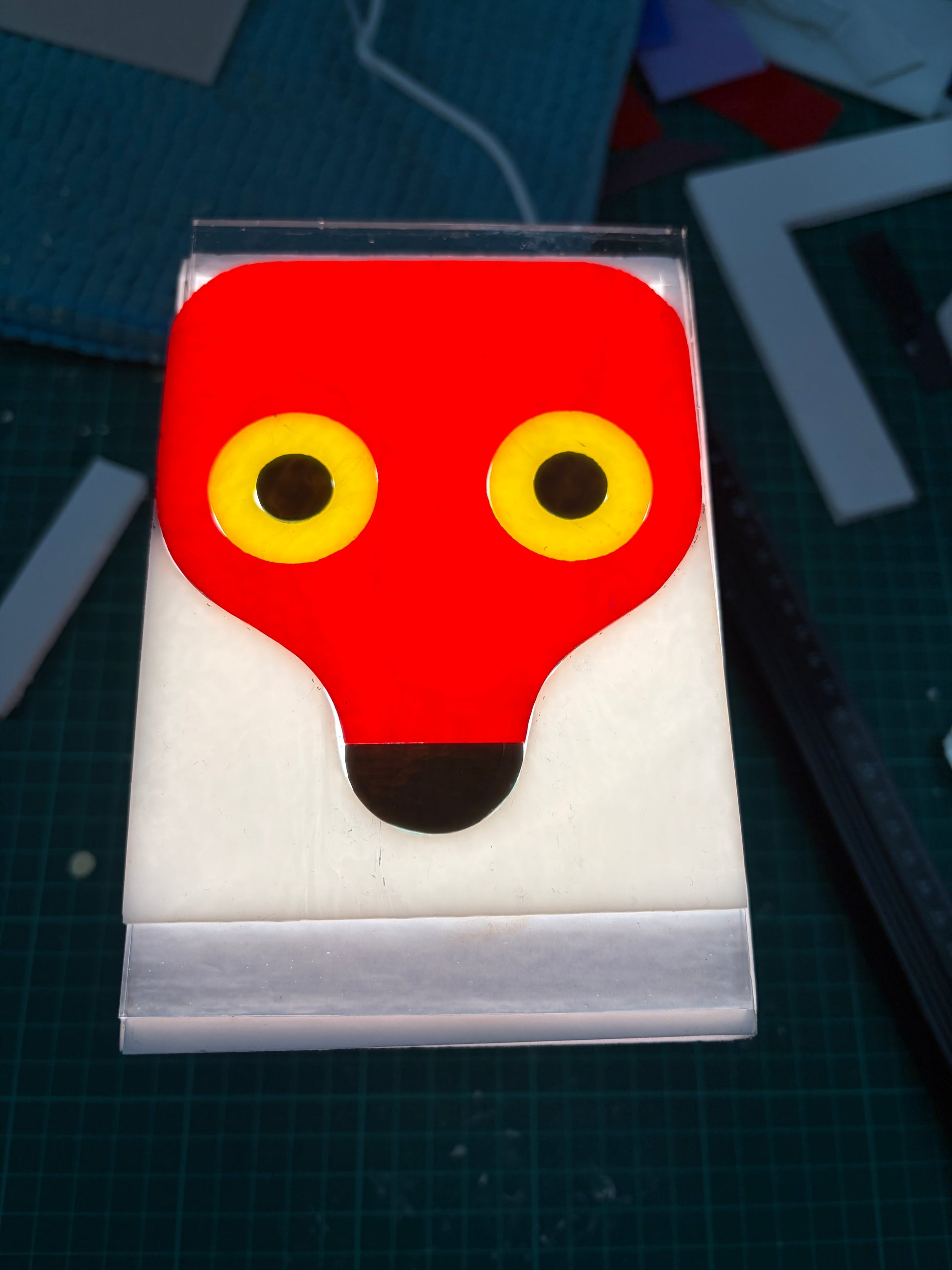 Runkoon kiinnitetyt lasit ovat käsin leikattua ja uunissa fuusioitua opaalista Bullseye-taidelasia. Sulatus tuo lasin ominaispiirteet esiin aina yksilöllisesti, tehden jokaisesta teoksesta uniikin. Lasia on sijoitettu hahmon piirteisiin eri tasoihin ja valon syttyessä syntyy optinen syvyysvaikutelma, joka muuttuu katsojan näkökulman mukaan.